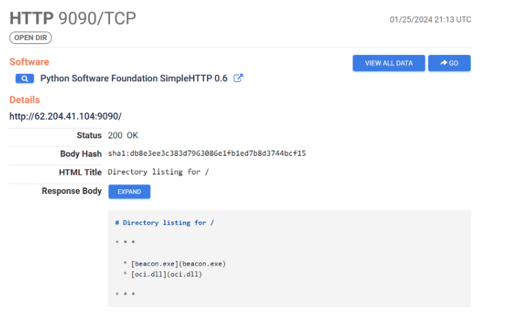 One of the results is a server hosting procdump.exe, beacon.exe and shell.exe.