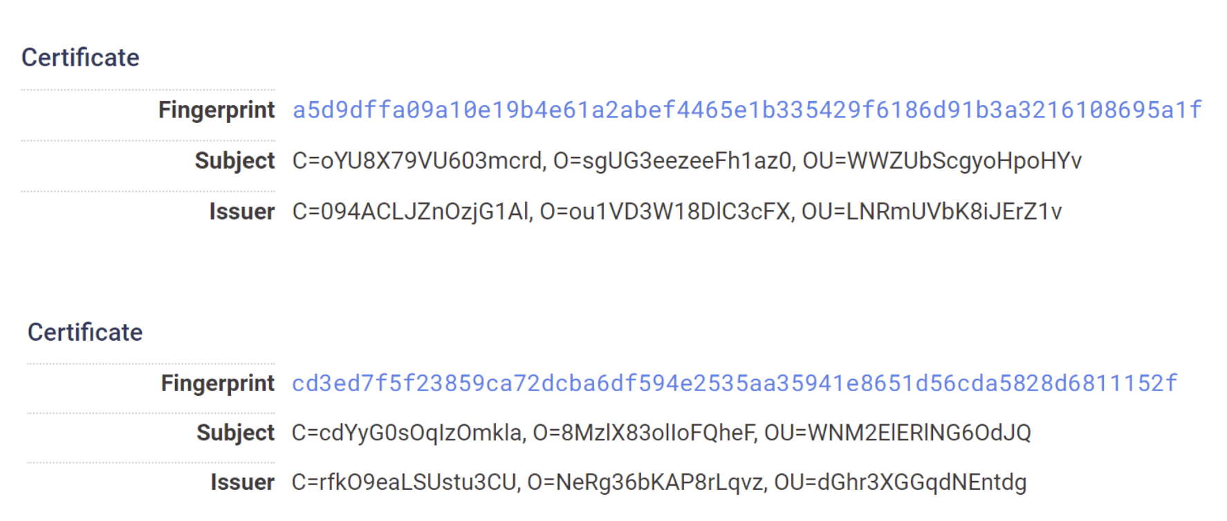 Below we can observe two certificates. Both the subject and issuer contain only the “C”, “O” and “OU” fields. (This contrasts with a “typical” certificate, which would contain also contain the “ST” and “L” fields)