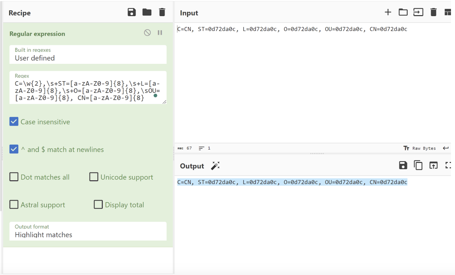 Bringing the two issuer values to Cyberchef, we can prototype a regular expression that captures the values from both certificates.