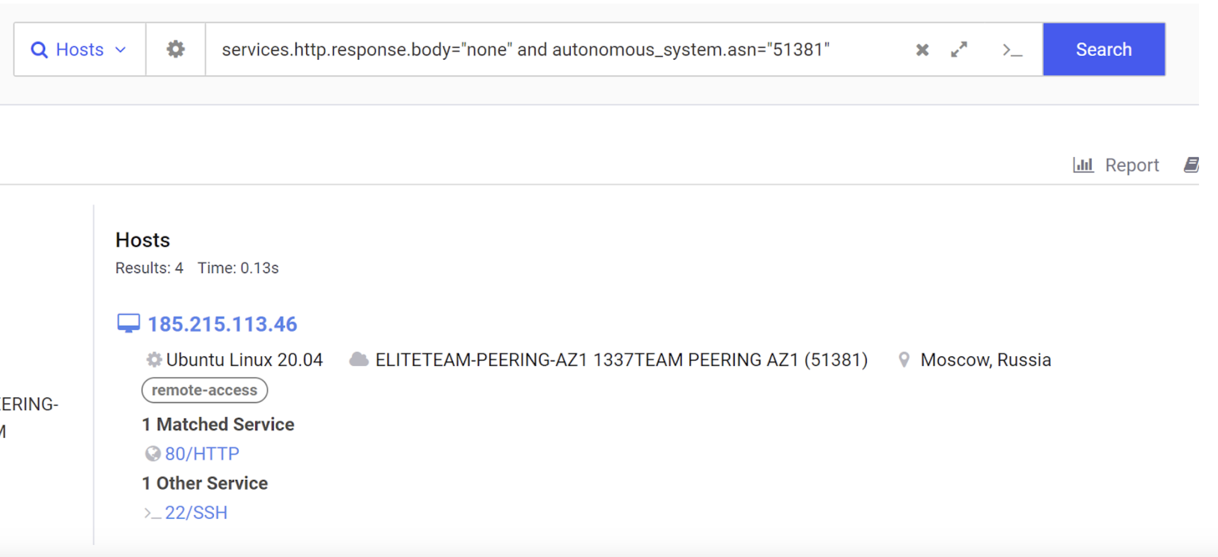 Returning to the initial results on the host page for 185.215.113[.]68, we can see that the server is hosted in Moscow with an Autonomous System Number of 51381.