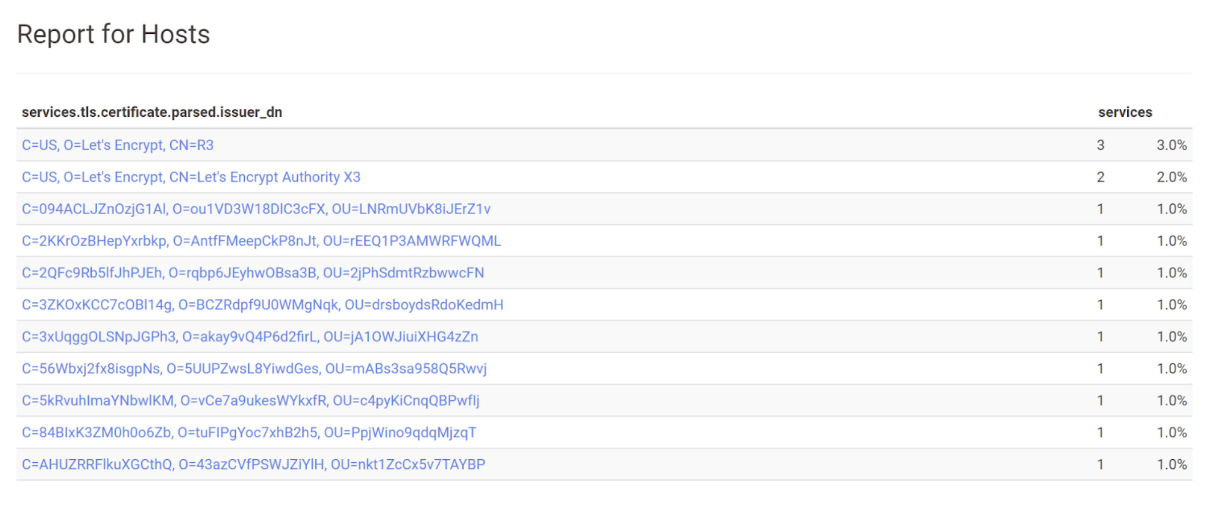 We can go ahead and generate another search report on the services.tls.certificate.parsed.issuer_dn to confirm that the results are matching as intended.