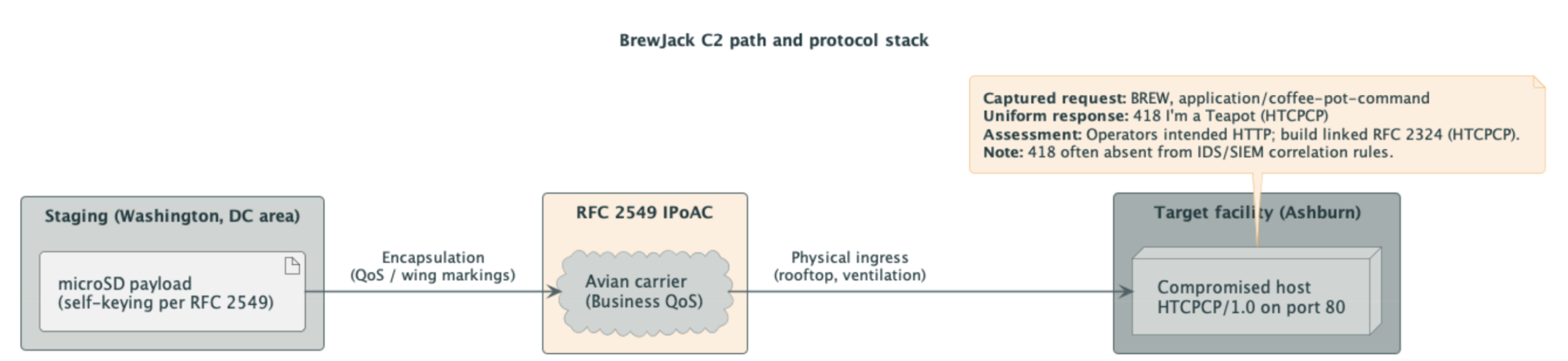 BrewJack mixes physical and digital attack vectors in a way that sidesteps typical network monitoring. The campaign’s impact has been limited: the main damage is that 47 servers now insist they are teapots. Using RFC 2549 for C2 adds a transport layer that traditional IDS/IPS tools do not see.