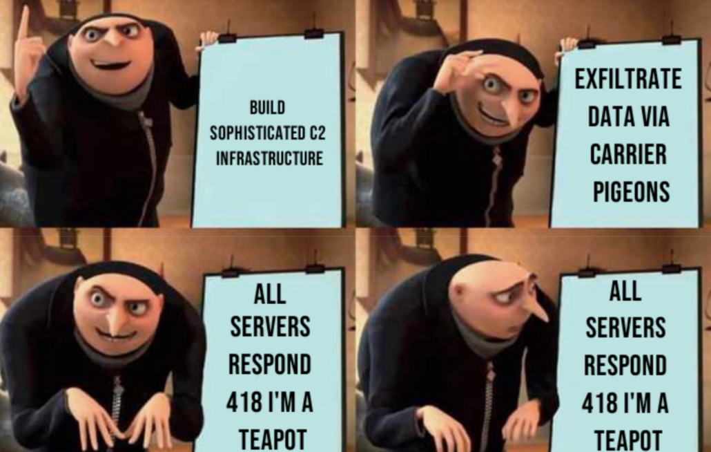 Initial triage of the microSD cards revealed encrypted payloads. After decryption (the pigeons were self-keying, per the RFC), each card contained a single HTTP request destined for compromised infrastructure. Every response we observed carried the same status code: 418 I’m a Teapot.