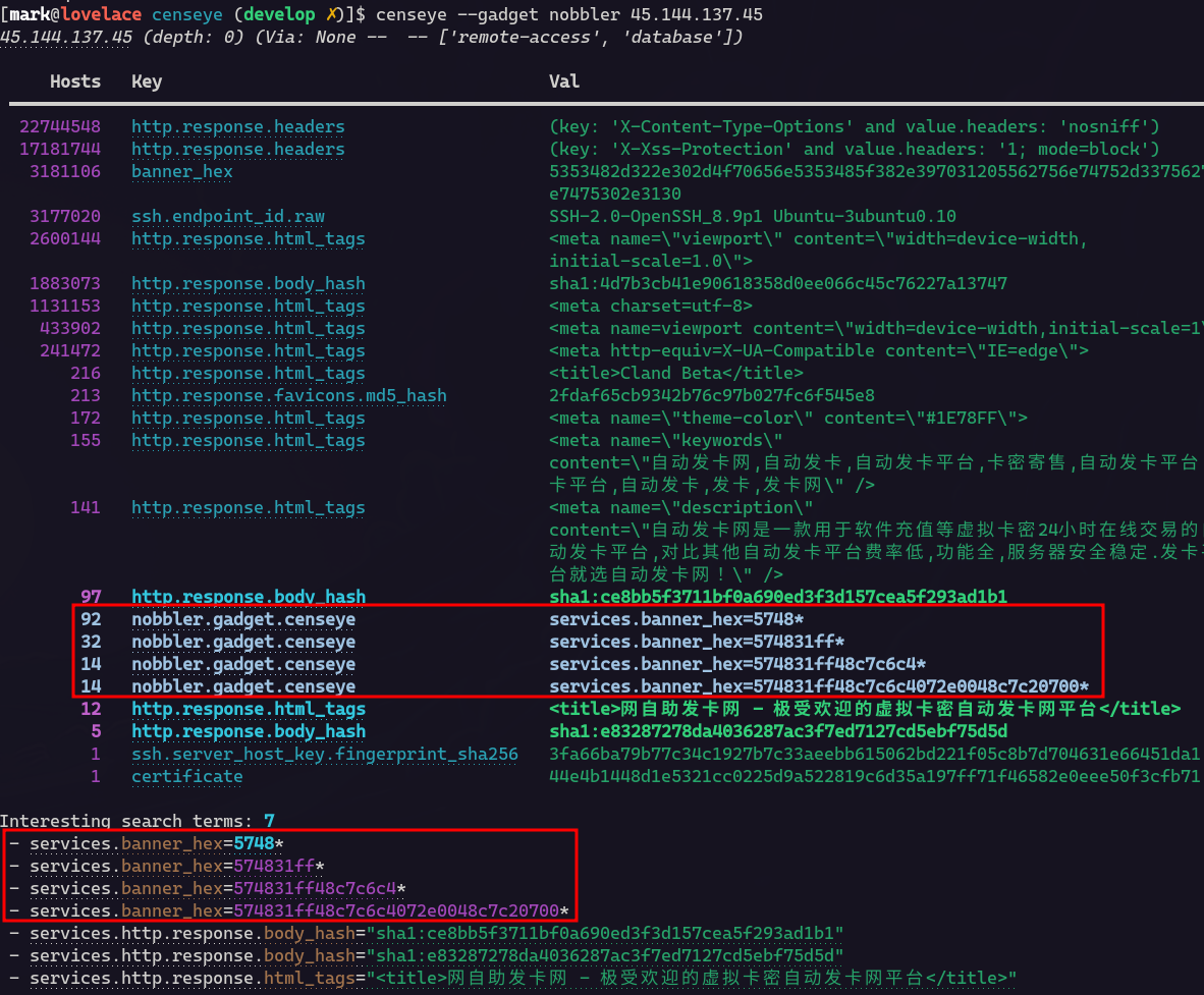 We encountered a random host (45.144.137.45) with an unusual set of services that Censys couldn’t identify. Running Censeye with the “nobbler” gadget enabled using the following command: