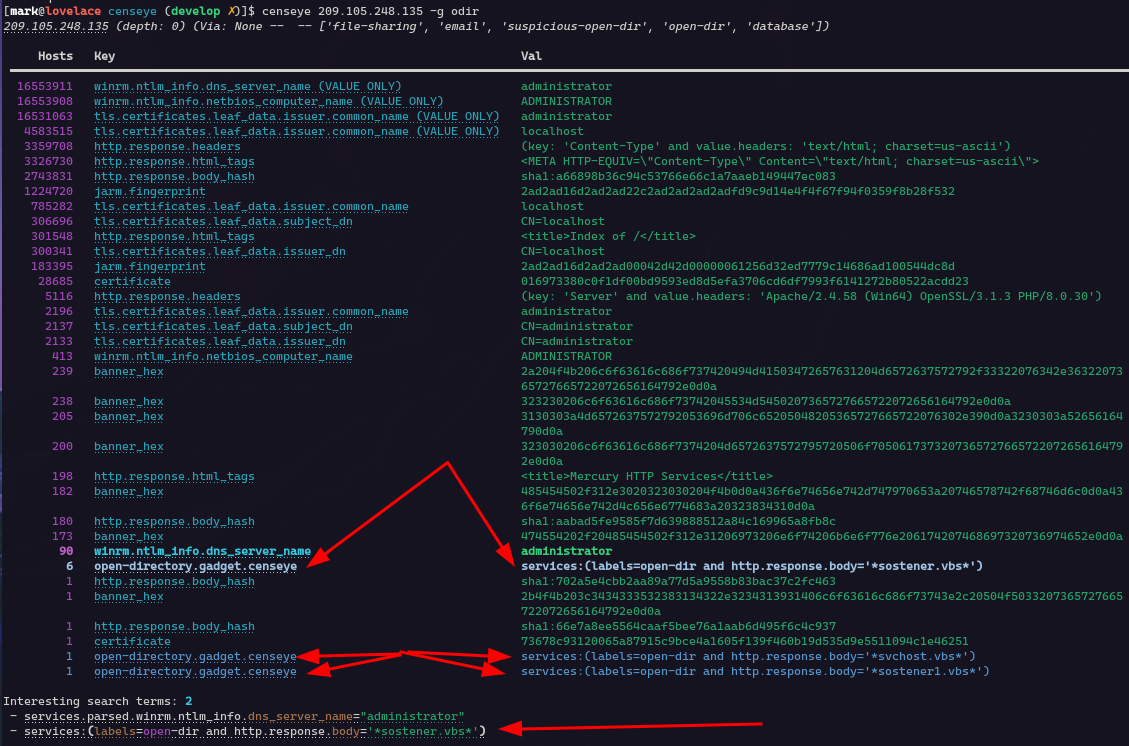 In the screenshot below, we ran Censeye against 209.105.248.135 using the “-g odir” flag, which enables the open directory gadget. The report now includes several keys labeled “open-directory.gadget.censeye“, with values containing Censys search queries to find specific filenames on other hosts.