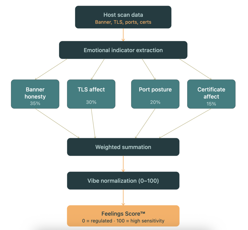 - The score is derived from a multifaceted emotional analysis of observable host characteristics including banners, TLS configuration, open ports, and overall vibe.