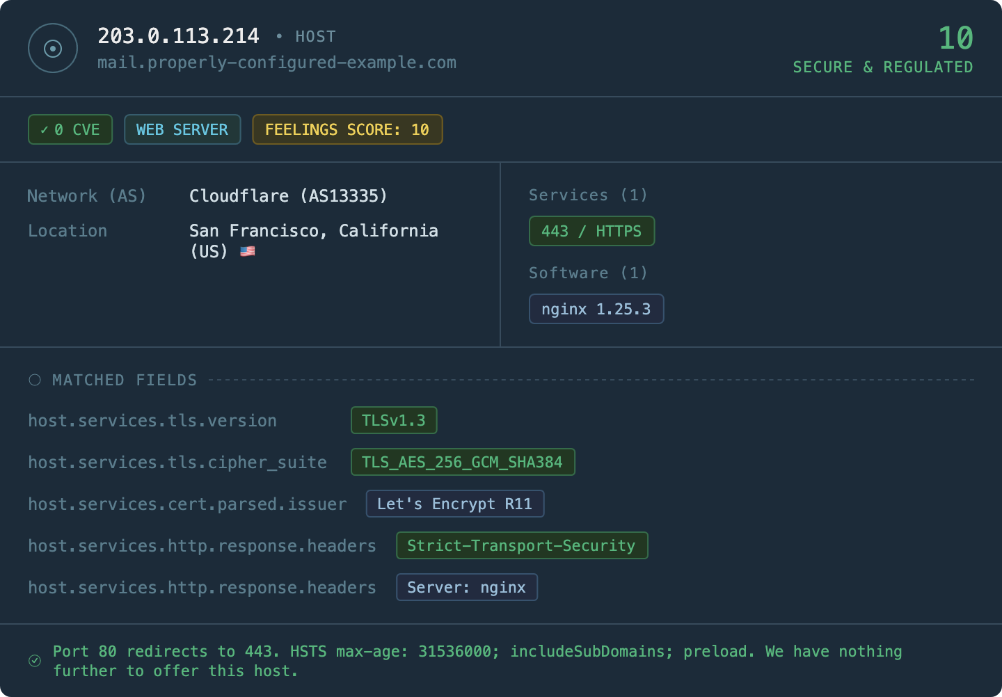 Third, if the host must remain Internet-facing, address the specific contributing factors to its Feelings Score™. Enable TLS. Close ports that serve no current purpose. Renew the certificate. These actions will not only reduce the Feelings Score™ but will also, as a side effect, meaningfully improve the host’s actual security posture, which was the point all along.