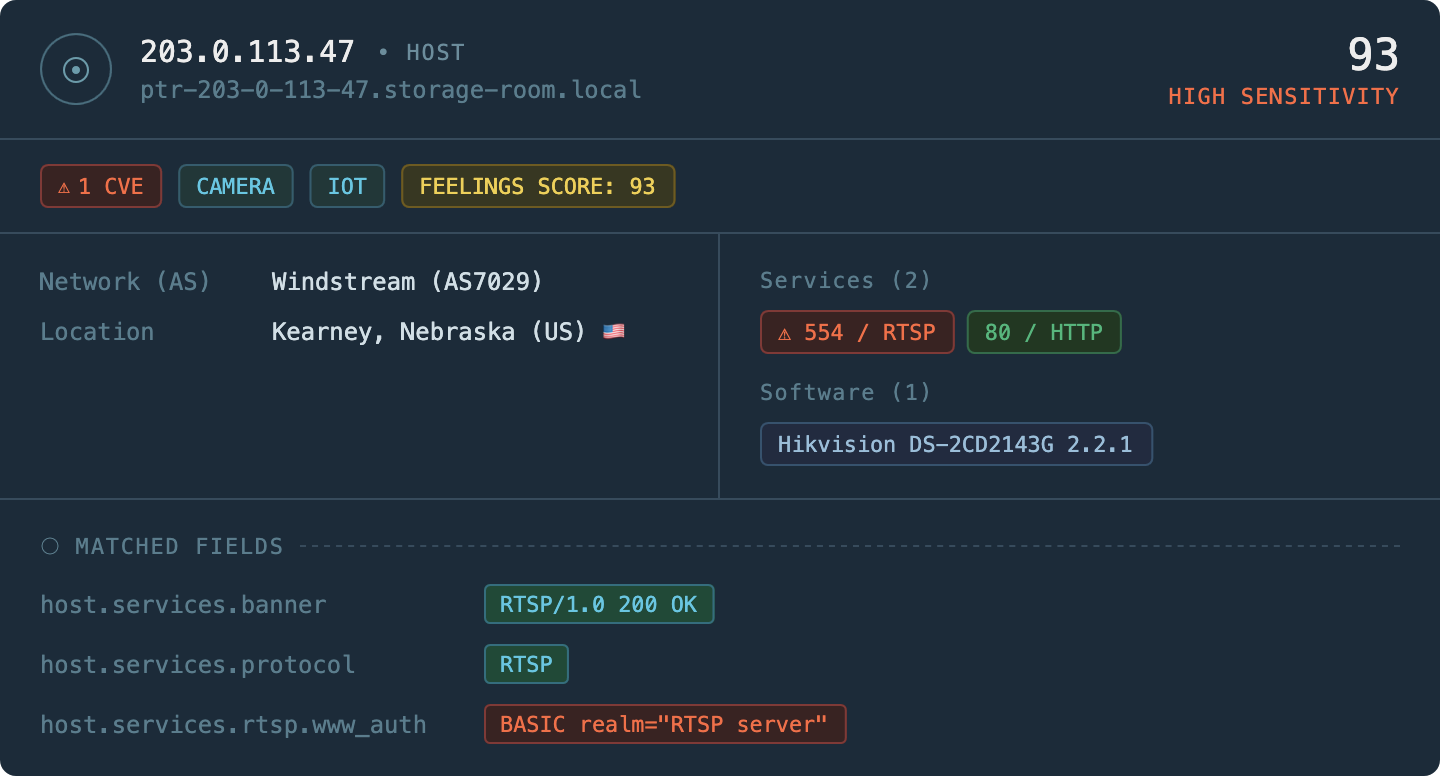 At Censys, we have spent years developing frameworks for understanding host exposure. We track open ports, running services, certificate hygiene, vulnerability indicators, and dozens of other observable signals that tell us something meaningful about the security posture of a given host. These frameworks are rigorous, evidence-based, and widely used by security practitioners who need to understand their attack surface.