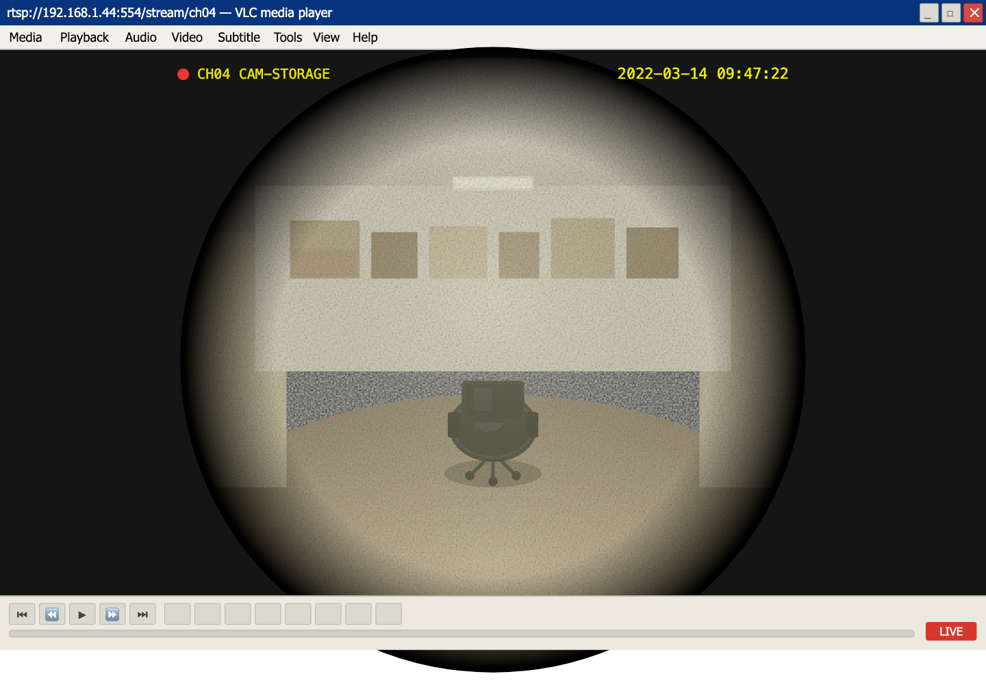 The stream is live. It is displaying an office chair in what appears to be a storage room. The chair is unoccupied. It looks like a comfy chair. Someone bought that chair for a reason.