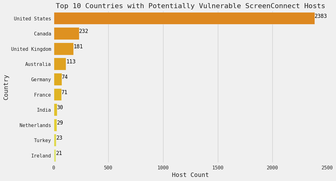Figure 3. Top Countries with Exposed Potentially Vulnerable ScreenConnect hosts, 27 February 2024