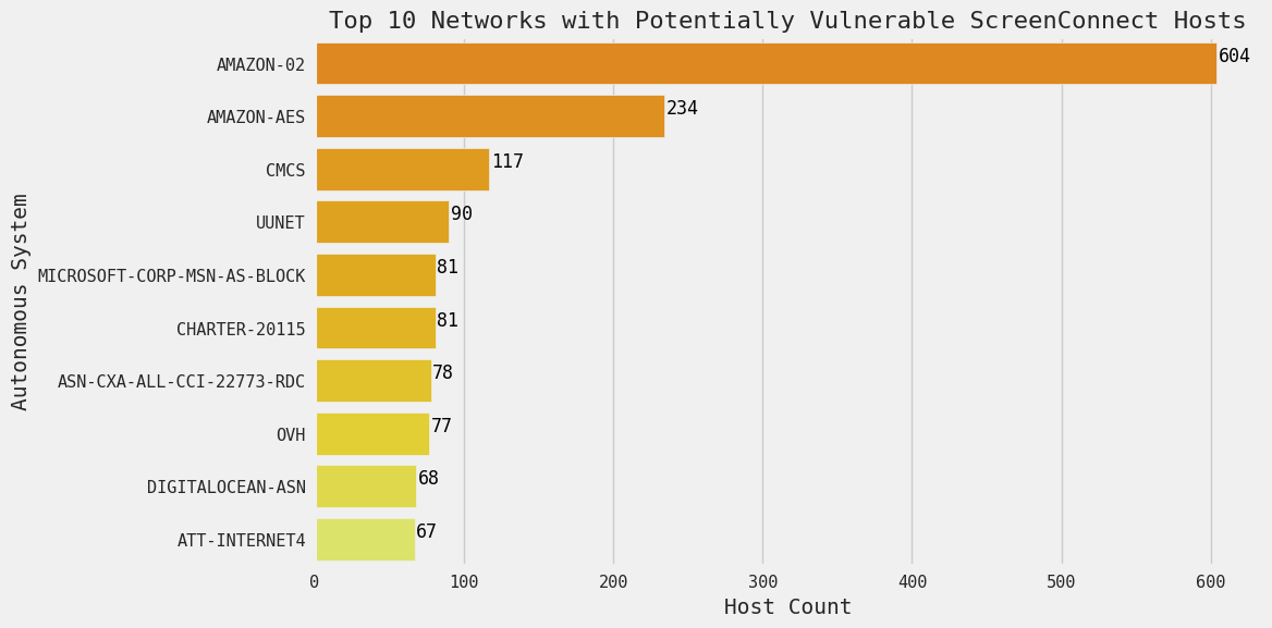 Figure 4. Top Networks with Exposed Potentially Vulnerable ScreenConnect hosts, 27 February 2024