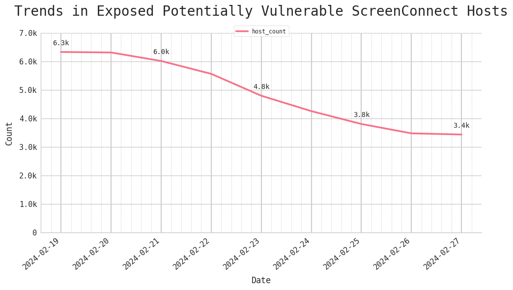 • As of Tuesday, 27 February, Censys observed over 3,400 exposed potentially vulnerable ScreenConnect hosts online, most running version 19.1.24566. Since the patches were released on 19 February, Censys has been observing an ongoing decline in potentially vulnerable instances exposed on the Internet; the number has dropped by 47.7% in the past week since the patches were released.