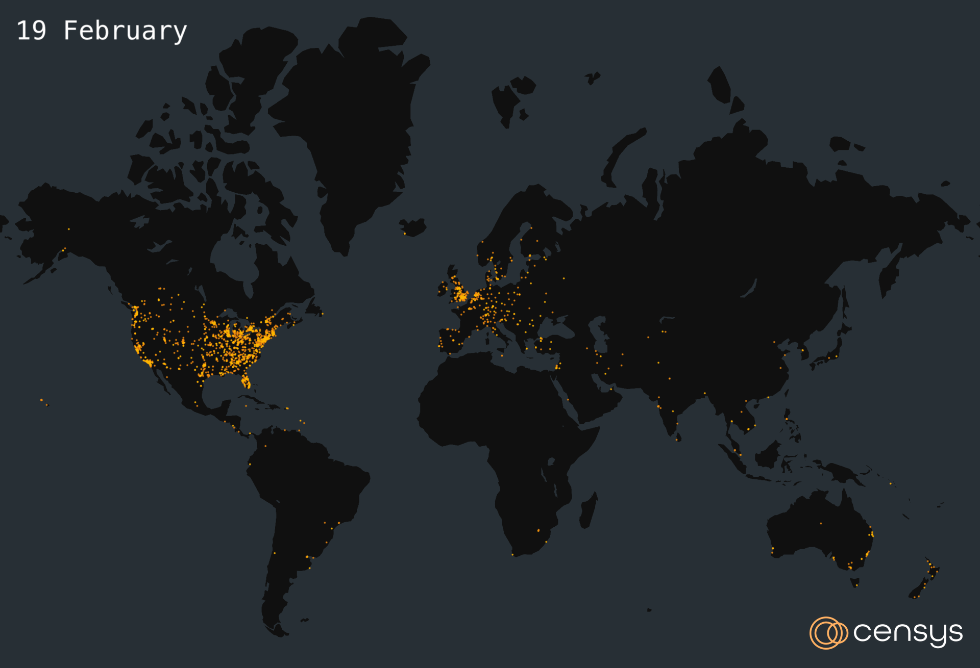 The figure below depicts a time lapse map of where vulnerable ScreenConnect hosts were located from 19 February to 27 February.