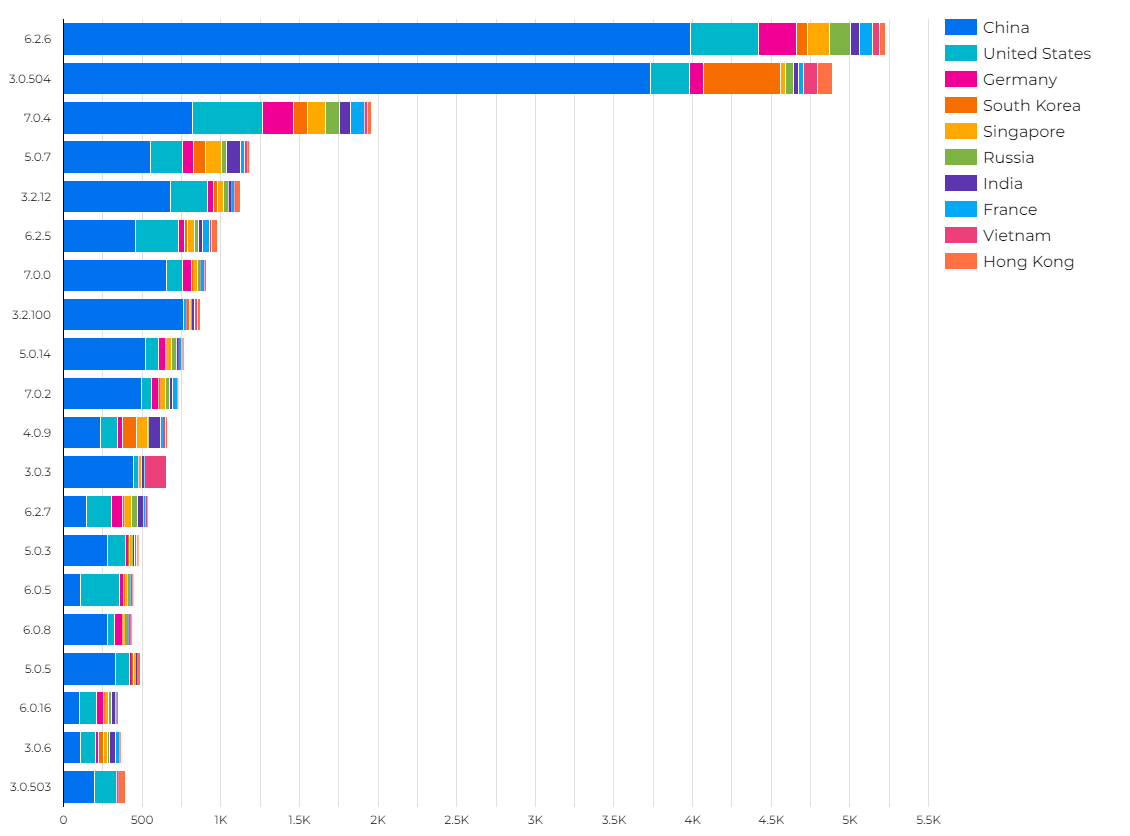 Unfortunately, our findings show that this protected mode is not a silver-bullet solution, as most unauthenticated Redis services are running versions above 3.0.0. For example, China has 3,989 unauthenticated Redis services running version 6.2.6 and 3,730 services running 3.0.504. The chart below shows the top twenty Redis versions we found without authentication, broken down by country, all of which use protected-mode capable versions.