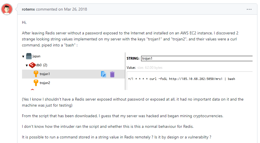 After reviewing known issues for the Redis server on GitHub, issue #4791 caught our attention. This user reported that their Internet-accessible Redis server had several keys which contained a crontab-formatted value that attempts to run a shell script fetched from a remote server that they did not set themselves. Worried that there may be an unknown vulnerability, the user requested assistance from the developers. A second user chimed in and confirmed that their server had been hit by something similar.