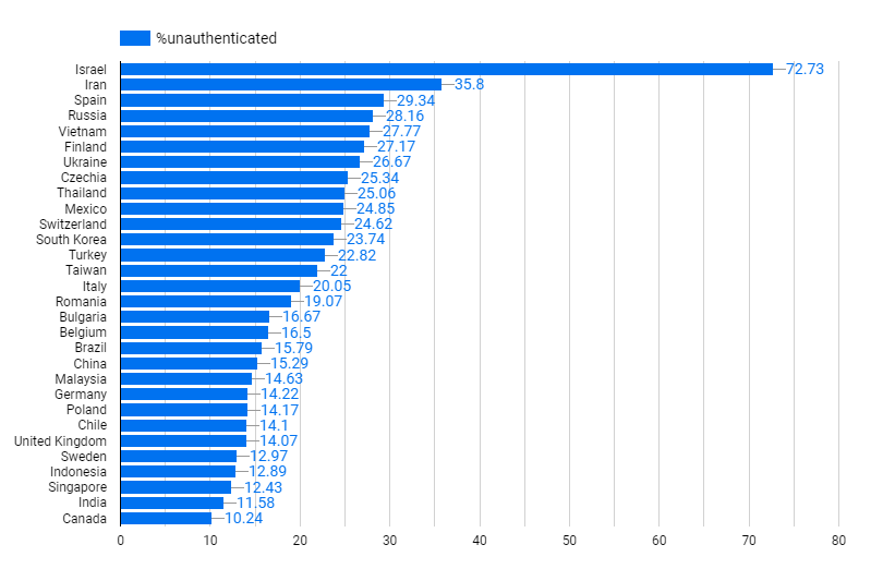 By looking at countries with more than 100 Redis services, we can visualize what regions of the world have the highest percentage of misconfigured Redis installs. In the graph below, we see that while the country of Israel only has 187 Redis services, but over 72% of them lack authentication. Israel is one of the only regions where the number of misconfigured Redis servers outnumber the properly configured ones.