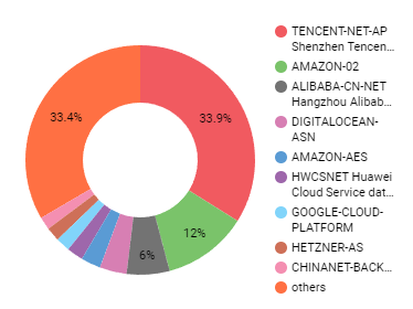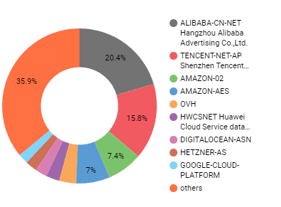 TENCENT-NET-AP (AS45090) has the highest number of unauthenticated Redis deployments, with 13,359 services and about 48 gigabytes of exposed data. But ALIBABA-CN-NET (AS37963), while only having 2,377 unauthenticated Redis services, has the most data exposed to the Internet with just over 60 gigabytes (62,341,142,583 bytes) of data.