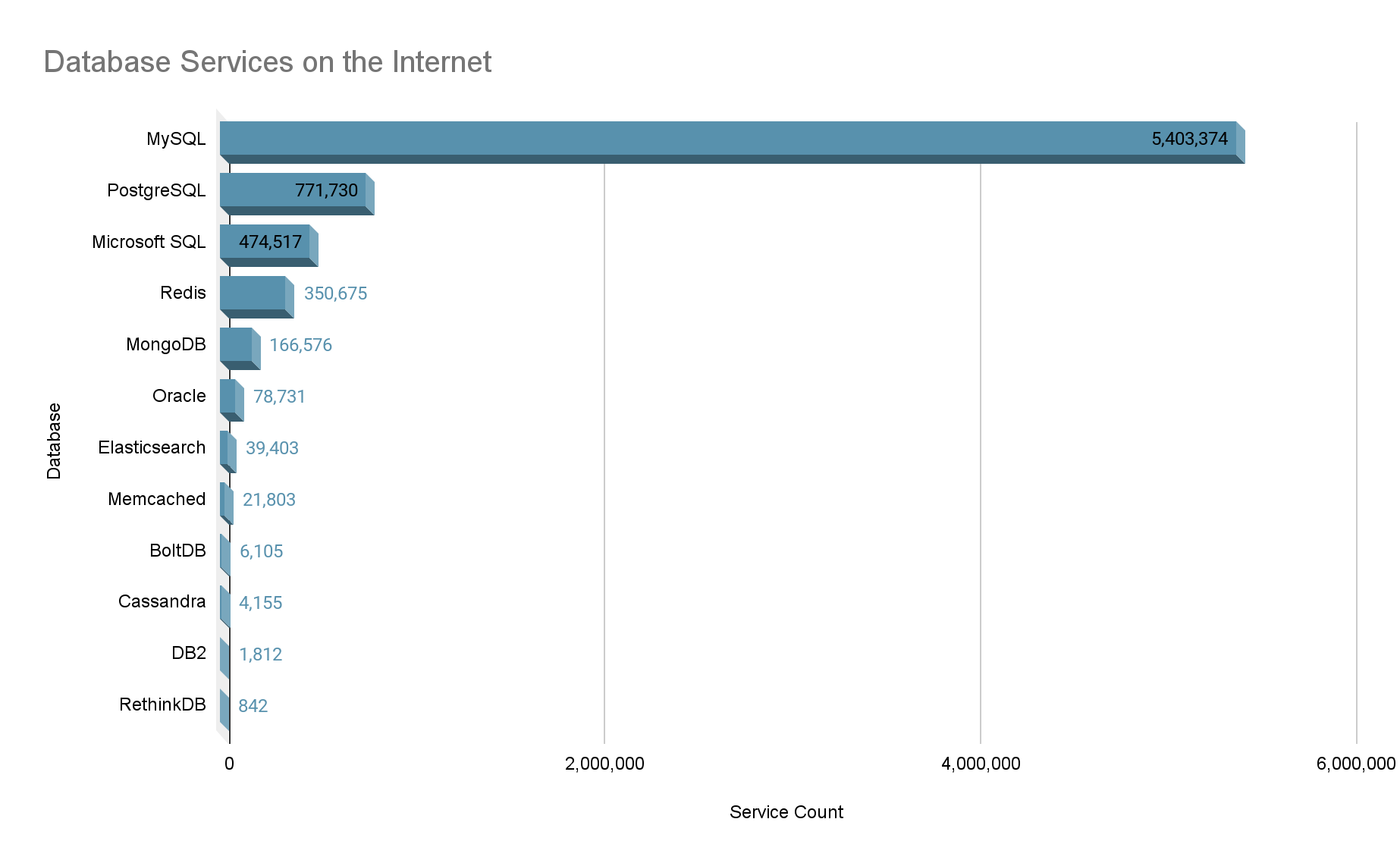 At the time of writing, there were 220,010,967 hosts with one or more exposed Internet services. Of those, 5,889,954 hosts (2.6% of the total) are running one or more of the twelve database technologies we will discuss throughout this series. Below is a graph showing our top databases ordered by the number of services.