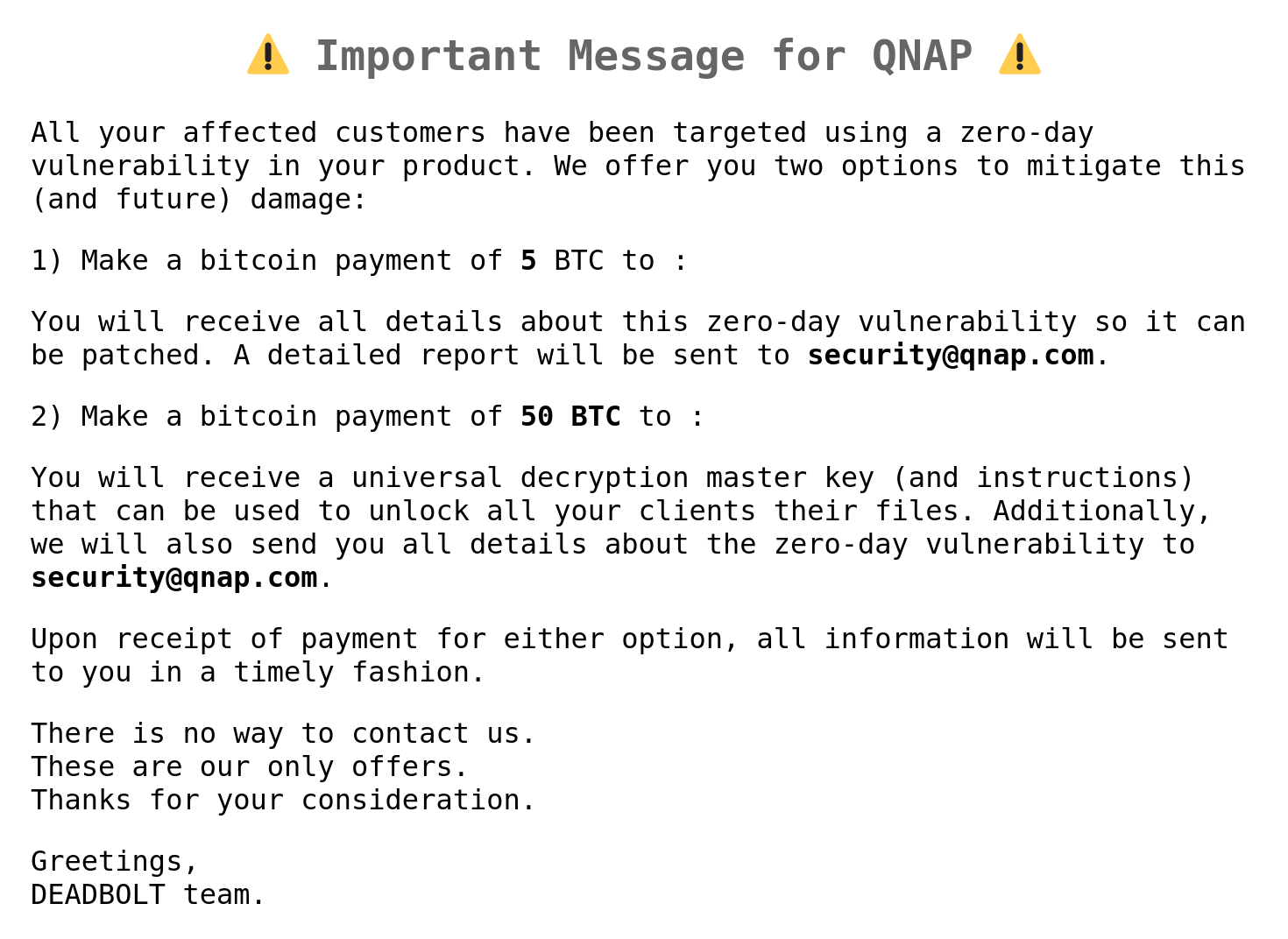 - The ransom for QNAP is the same: