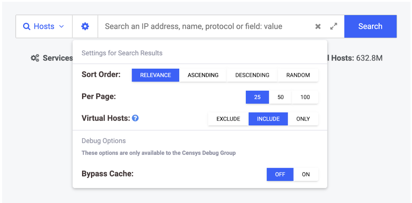 Our simple query will restrict results to Censys-visible HTTP servers that include the string “hacked by” on their web interface. We can include virtual hosts in these search results by first toggling the gear icon on the search homepage and selecting “Virtual Hosts: Include” as seen below.