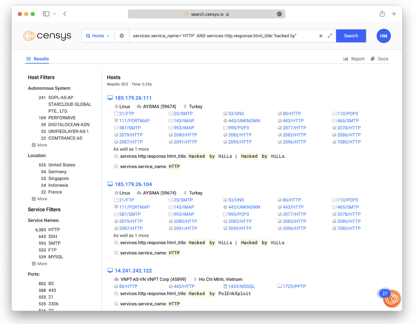 We’ll begin with one of the simplest ways to find defaced web servers: searching for the string “hacked by”. Threat actors commonly “sign their work” by leaving a message on a website, such as “Hacked by [actor handle]”. Think of it like an artist’s signature on a work of graffiti. Luckily these signatures help defenders and researchers who are hunting for affected web servers. We can use Censys to search for these affected sites all over the world simply by looking for defacements.