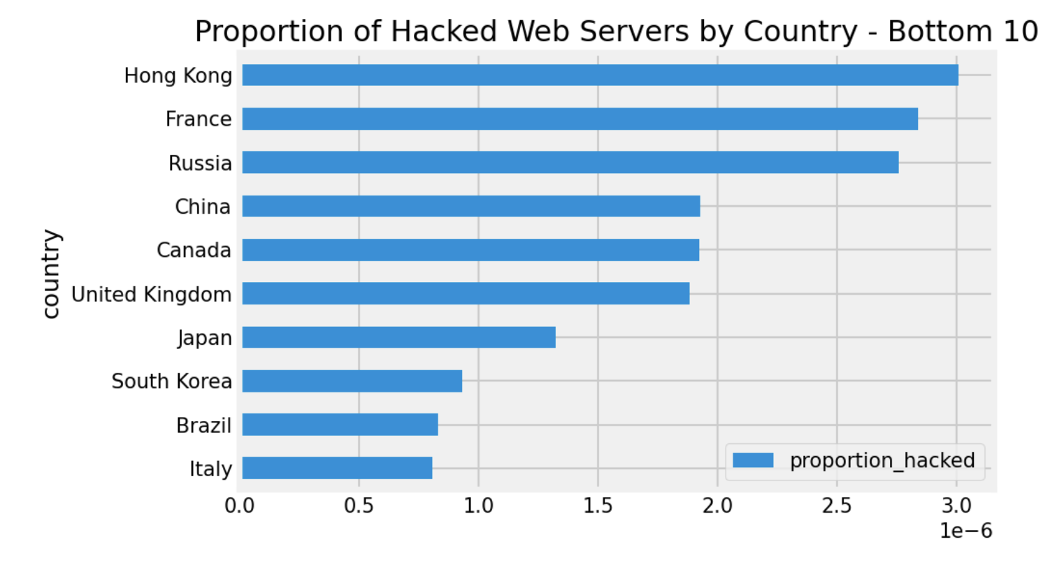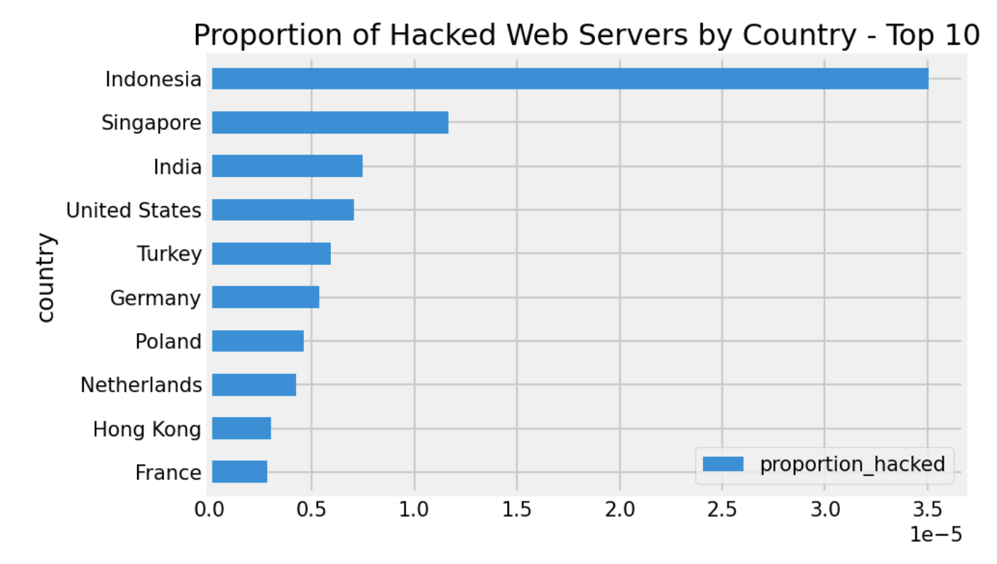 Italy, by contrast, has the lowest rate of defaced web servers from our perspective. It’s interesting to study various factors that may explain these findings, which may point to the opportunity for a broader study.