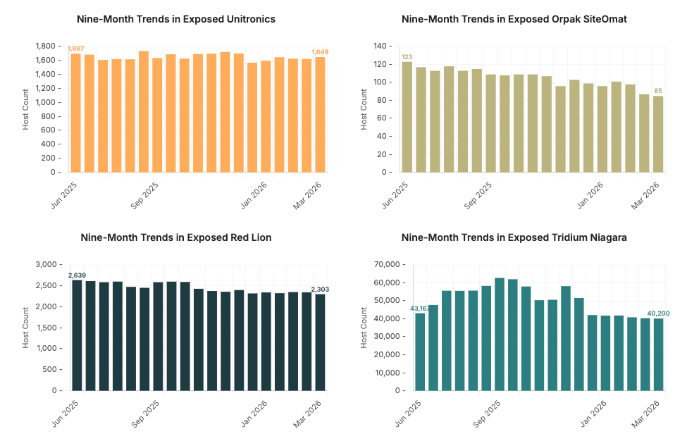 While we observe decreases in the Internet exposure of each of these systems, the decreases do not all follow the same trajectory. Orpak SiteOmat has the most clear, steady decline across the study timeframe. Unitronics and Red Lion are relatively steady with modest decreases. Tridium Niagara has the most unusual profile of the systems studied, peaking in September 2025 with over 62,000 instances observed before settling back around 40,000 as of our latest look in March 2026. It’s unclear what might have caused this swell in Tridium Niagara, but since early January 2026, exposures have remained relatively stable with minor decreases.