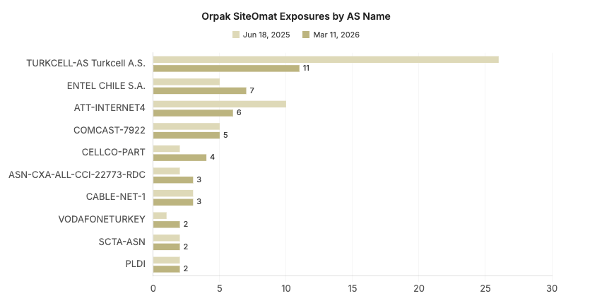 - All devices observed experienced at least a minor decrease in global exposure from June 2025 to March 2026, ranging from Orpak SiteOmat’s 30.9% decrease to a 2.8% decrease in Unitronics exposures.