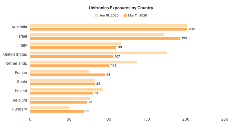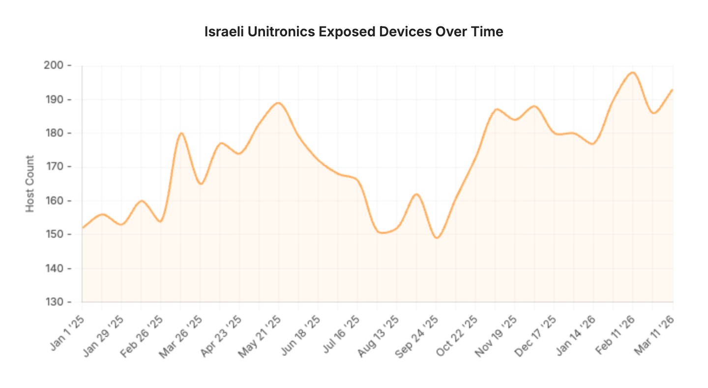 Examining Israel’s Unitronics presence more closely, we observe a clear decrease in exposures beginning in May 2025 that bottoms out throughout late August and September. While we can’t make causal statements, this timeframe aligns with increased concerns about offensive Iranian cyber activity. Since late September 2025, Unitronics exposures have steadily increased, with nearly 200 online in Israel as of mid-March 2026.