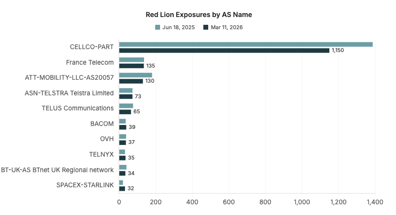 CELLCO-PART and ATT-MOBILITY decreases (17.1% and 27.8%, respectively) reflect decreases in Red Lion’s U.S. footprint, while STARLINK hosts several more instances of Red Lion, primarily in the U.S. Similar to observations of other ICS devices and systems, most instances of Red Lion are found on mobile or consumer ISP networks.