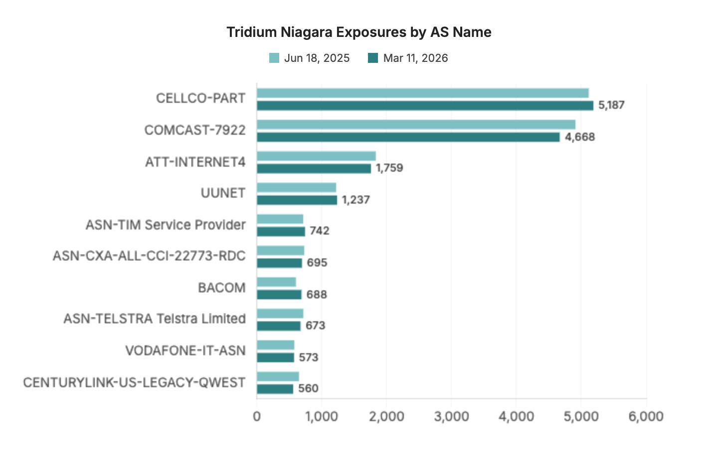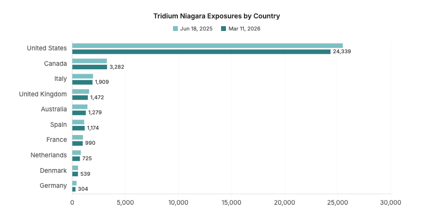 Additionally, the scales of each of these exposures are very different. We began our study in June 2025 with over 43,000 Tridium Niagara systems exposed globally, while we observed 123 Orpak SiteOmat exposures for the same snapshot date. While we discuss changes of exposures over time, it’s important to consider that a hypothetical 10% decrease in Tridium Niagara would look very different from a 10% decrease in Orpak SiteOmat exposures. We must also be mindful of drawing strong conclusions from devices with relatively small online presence.