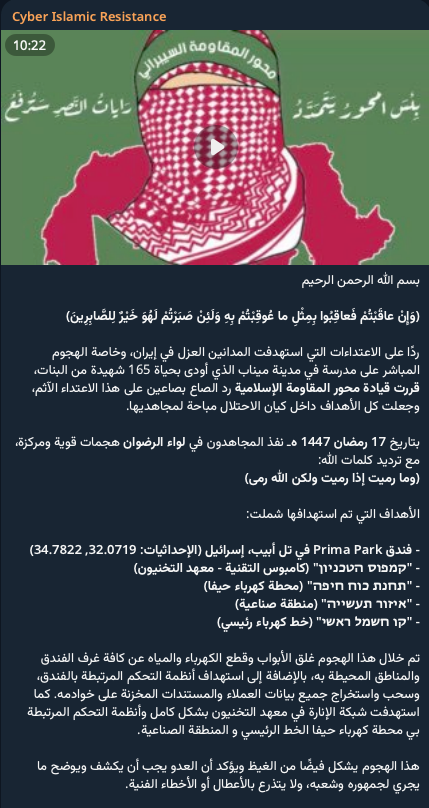 In this message and accompanying video, they claim attacks on several targets in Israel, including a hotel in Tel Aviv where “…the doors were locked, and electricity and water were cut off to all rooms of the hotel and the surrounding areas.” They also claim to have targeted “the entire lighting network” at a university in Haifa.