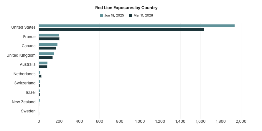 The U.S. continues to lead in Red Lion exposures despite a 15.8% decrease over the studied snapshots, with the next largest geographic footprints in France, Canada, and the U.K. an order of magnitude smaller.