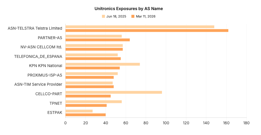The most dramatic decrease observed is a 53% drop in exposures on CELLCO-PART, a Verizon network where we’ve previously observed large numbers of ICS devices. That decrease in particular is driven by the drop in U.S.-based Unitronics devices, while the 27% decrease on KPN corresponds to the drop in exposures observed in the Netherlands.