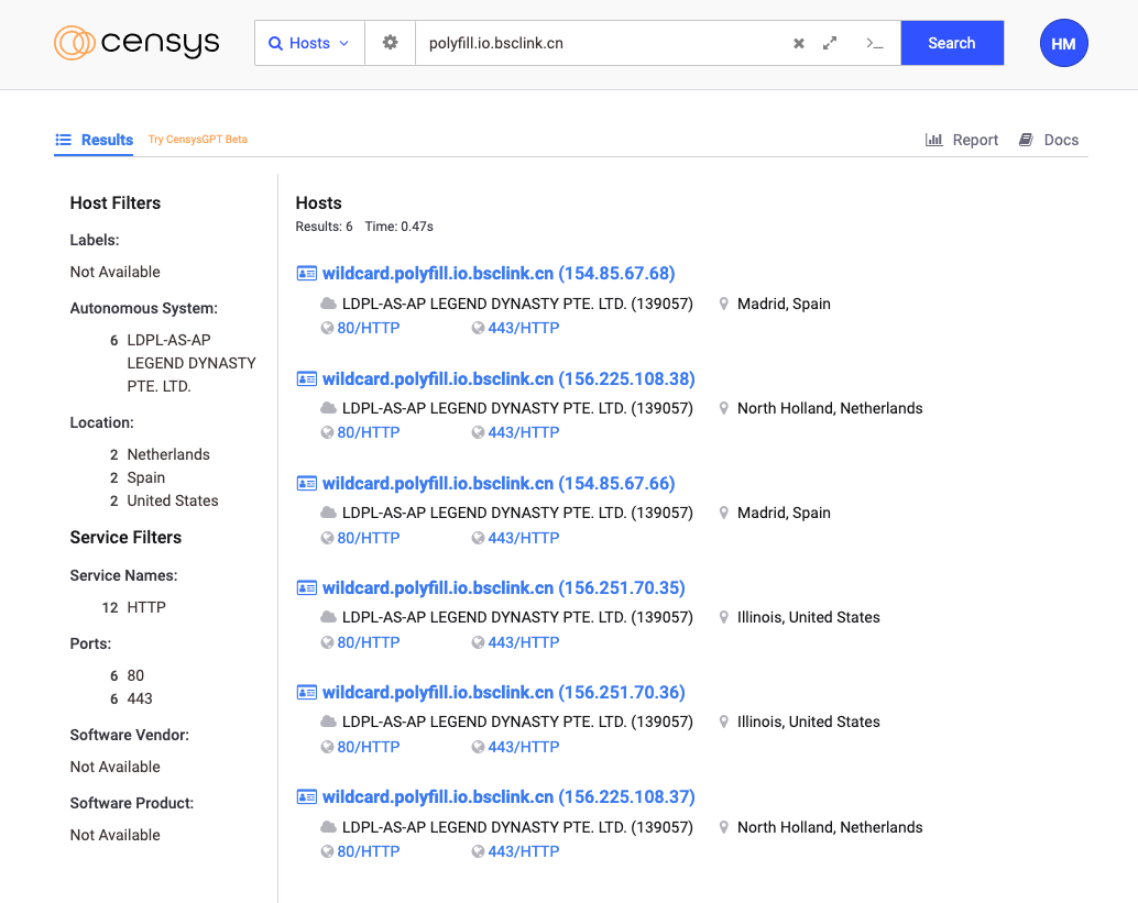 - Censys Search query for exposed hosts referencing the malicious polyfill[.]io domain