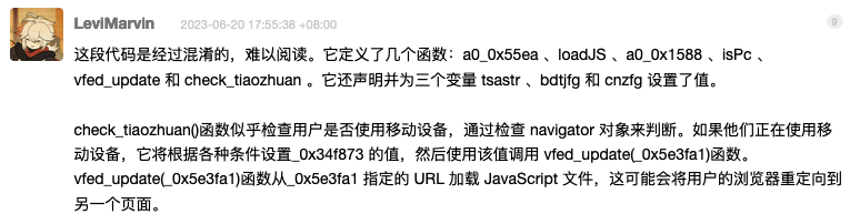 Translated: “The check_tiaozhuan() function appears to check if the user is using a mobile device by checking the navigator object. If they are using a mobile device, it sets the value of _0x34f873 based on various conditions and then calls the vfed_update(_0x5e3fa1) function with that value. The vfed_update(_0x5e3fa1) function loads a JavaScript file from the URL specified by _0x5e3fa1, which may redirect the user’s browser to another page.”