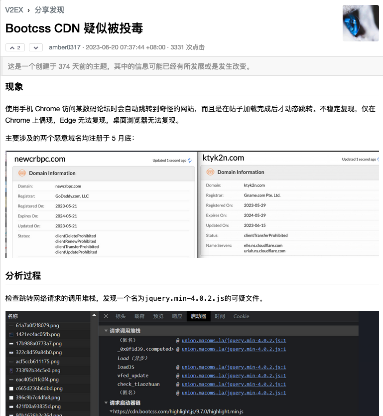 - “This evil jQuery was introduced by highlight.js hosted on cdn.bootcss.com. When the request for highlight.js has a specific Referer and mobile UA, the server will return highlight.js with malicious code, otherwise it will return normal code, which is highly disguised. Moreover, there are specific conditions for whether malicious jQuery is introduced when this code is executed.”