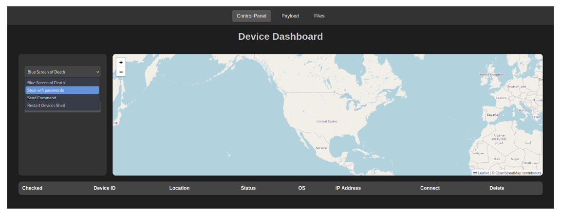 Besides the malicious open directory, we also see a “Device Dashboard” on Port 5000 that happens to look like a web UI for a C2 server.