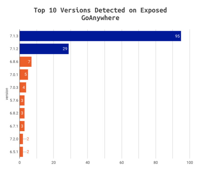 - Over 2 months after this zero day was disclosed, Censys continues to observe almost 180 hosts running exposed GoAnywhere MFT admin panels, with 30% of these (55 hosts) showing indications of remaining unpatched and potentially vulnerable to this exploit. A single vulnerable instance has the potential to serve as a gateway to a data breach that could potentially impact millions of individuals.
