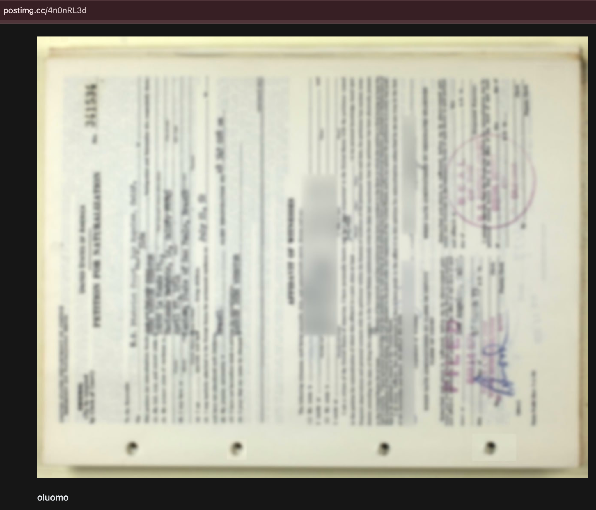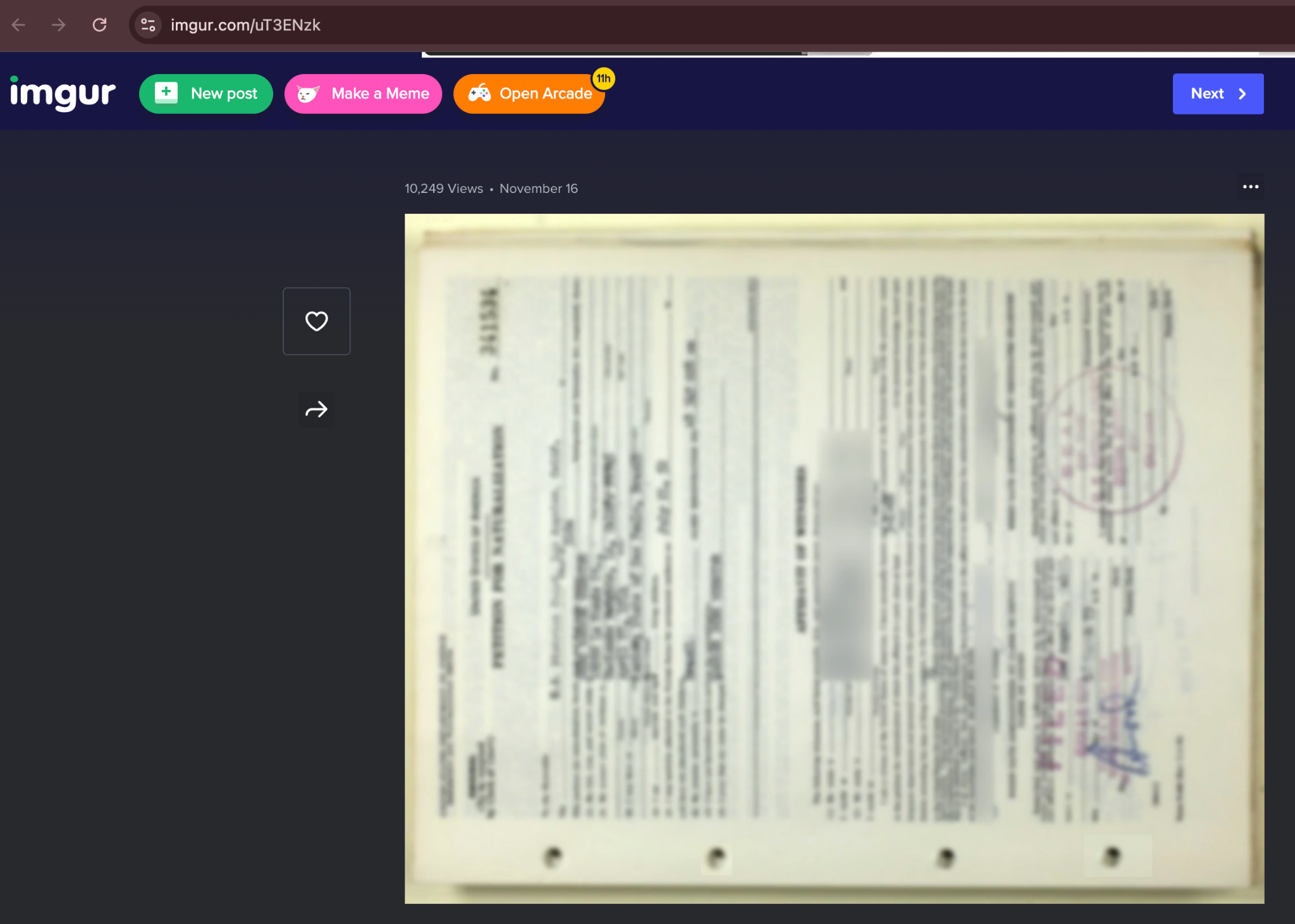 • The contextual lure is notable. The background image used across all observed deployments is a United States Petition for Naturalization, a document with a single known provenance: a genealogy blog post from 2015. The operator lifted this image and hosted it on Imgur, where view counts across four variants suggest thousands of potential exposures.