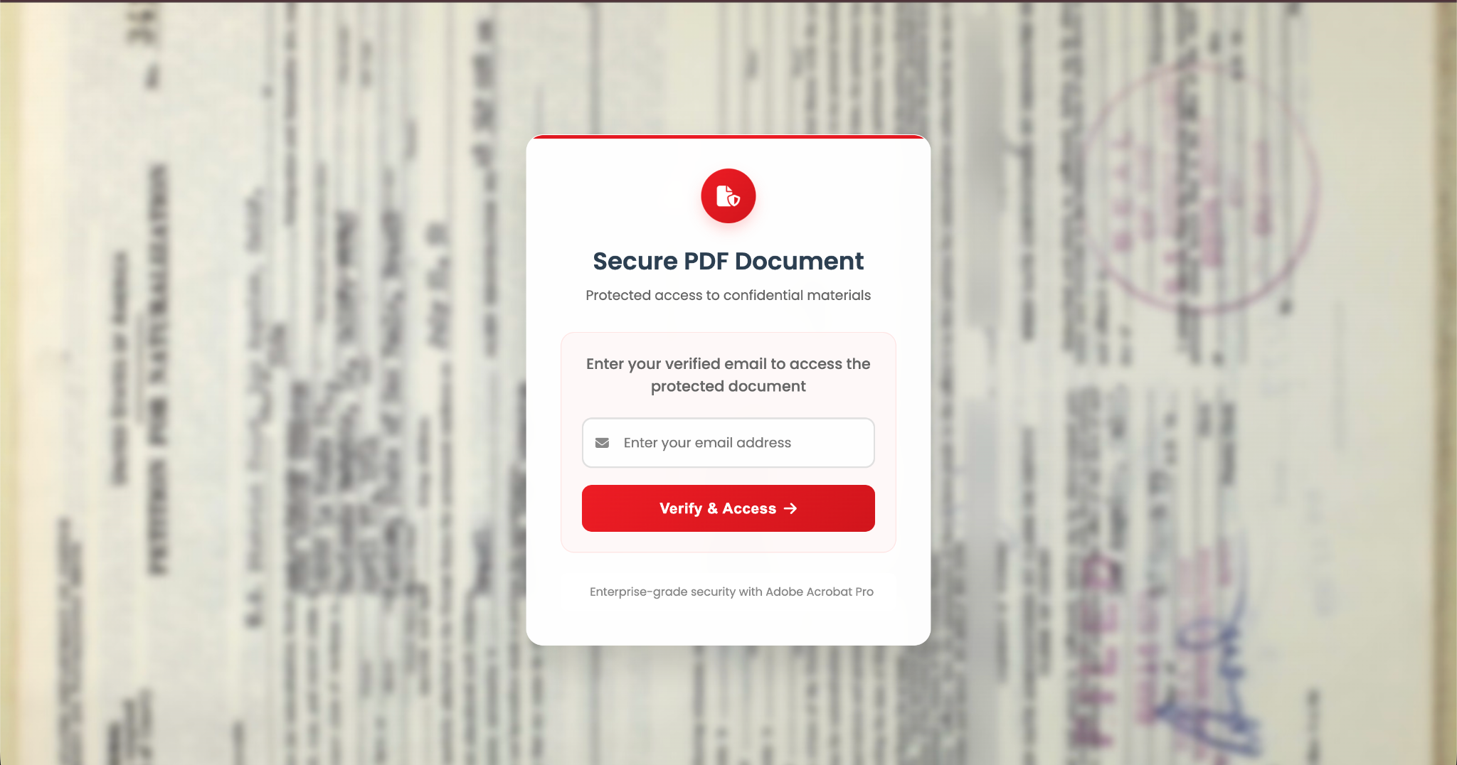 The first-stage page presents itself as a document access portal. The title, “Secure Document Access | Identity Verification”, is generic enough to serve as a pretext for any document type. The interface is clean: a centered card with a Poppins-font heading reading “Secure PDF Document,” a subtitle promising “Protected access to confidential materials,” an email input field, and a red “Verify & Access” button. A footer badge reads “Enterprise-grade security with Adobe Acrobat Pro.”