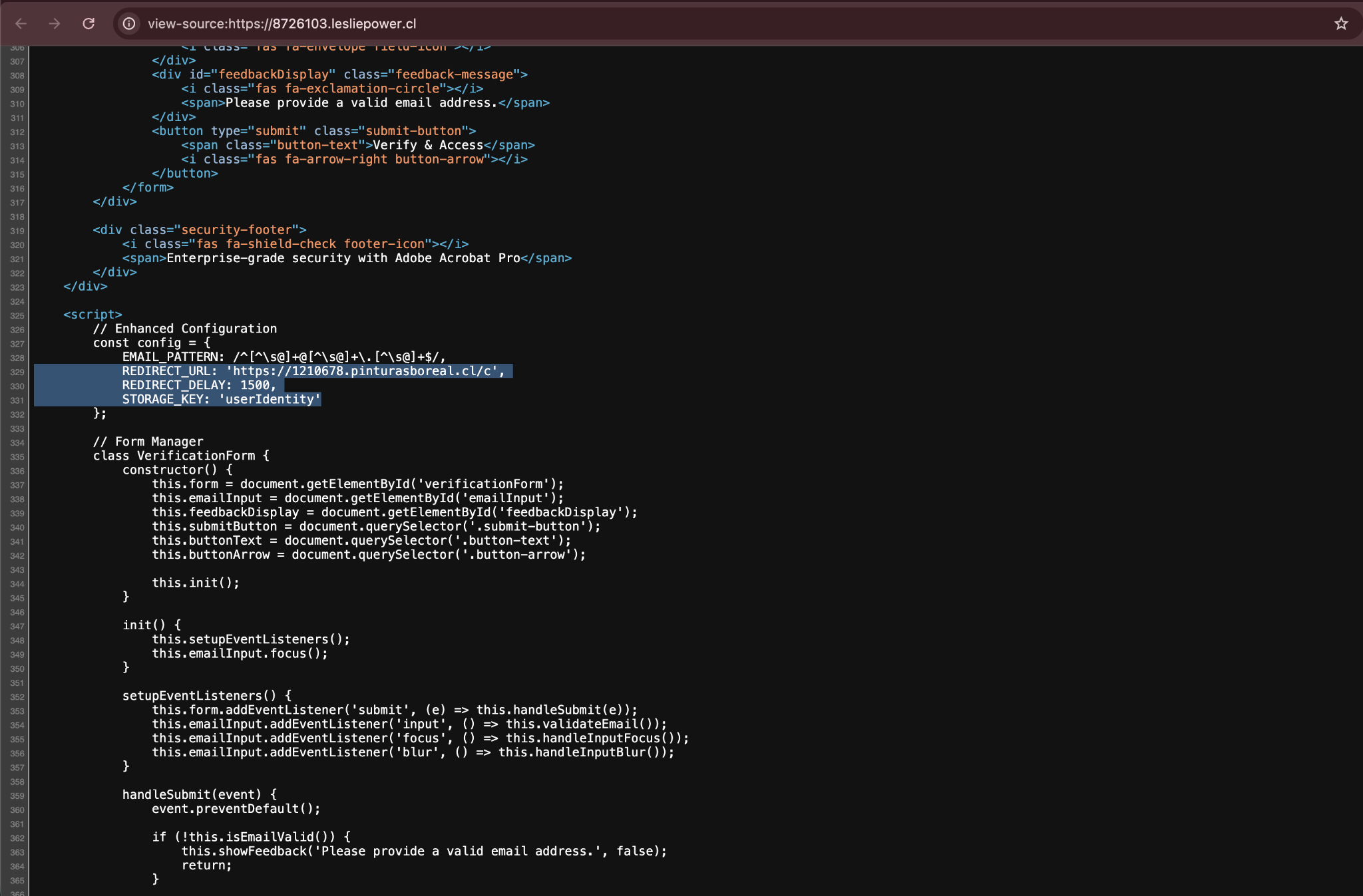 When a visitor enters an email address and clicks “Verify & Access,” client-side JavaScript stores the email in localStorage under the key userIdentity and redirects the browser to a hardcoded second-stage URL after a short delay (typically 1,500–3,000 milliseconds). The redirect targets a /c path on the second-stage domain.
