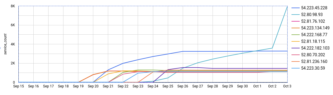 More interesting is where these hosts were located (geographically and AS-wise). At the time of writing, all hosts exist in the autonomous system AMAZON-02, one of the largest AWS networks. But, at the start of this event, two other ASs were seen with these hosts: AMAZON-AES (AS14618) and BJ-GUANGHUAN-AP (AS55960), both of which stopped these specific services nine days later, on September 29th. Below is a (log scaled) graph of each AS found with this disruptive service and the number of hosts.