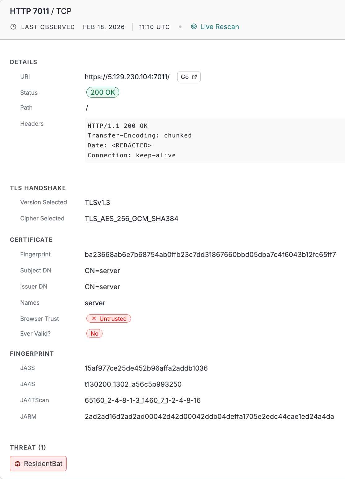 Open any host in the Platform to see service details: TLS version, certificate (e.g. CN=server, untrusted), JA3S/JA4S/JARM fingerprints, and the ResidentBat threat label, as in the host example below.