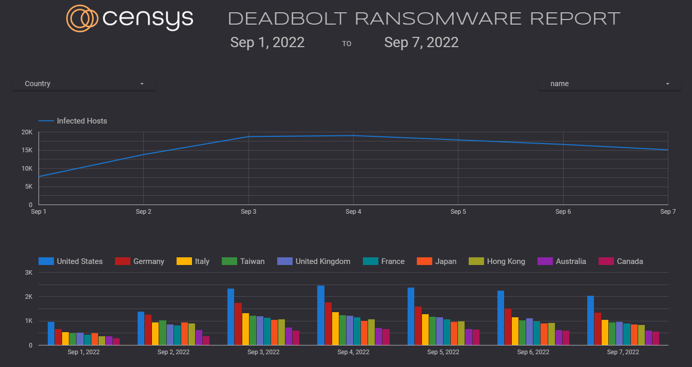 Finally, we have a seven-day view of Deadbolt on the internet, including graphs that break infections down by country. Researchers can use the dropdown menus to filter the countries they are most interested in analyzing.