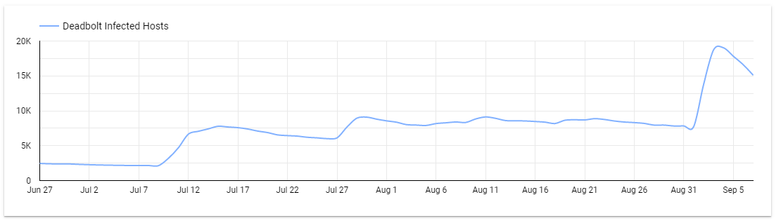 But the waves of infections over August have nothing on what happened at the beginning of this month. On September 2nd, 2022, we saw the number of unique hosts infected with Deadbolt jump from 7,748 to 13,802, and by September 4th, that number had risen to 19,029!