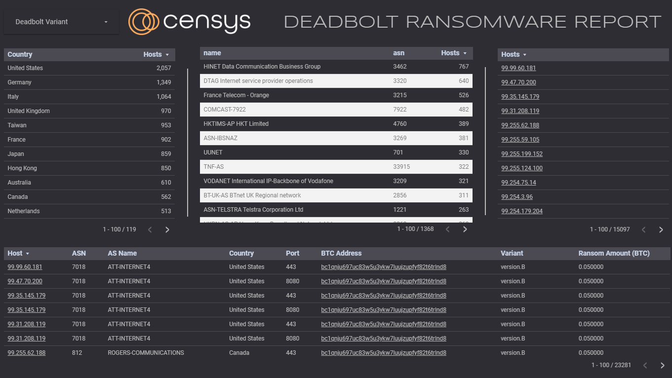 We’ll continue to monitor NAS devices infected with Deadbolt ransomware. In the meantime, you can start exploring the Censys Deadbolt Ransomware Report below.