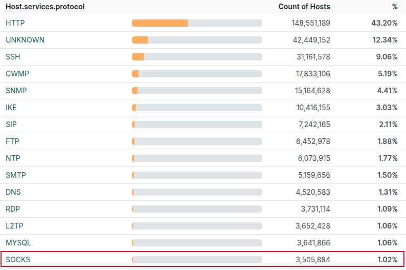 There are a lot of SOCKS servers on the internet — a lot, a lot. In Censys, SOCKS ranks as the 15th-most-observed protocol, with 3,486,509 unique hosts advertising one or more SOCKS services at the time of writing.