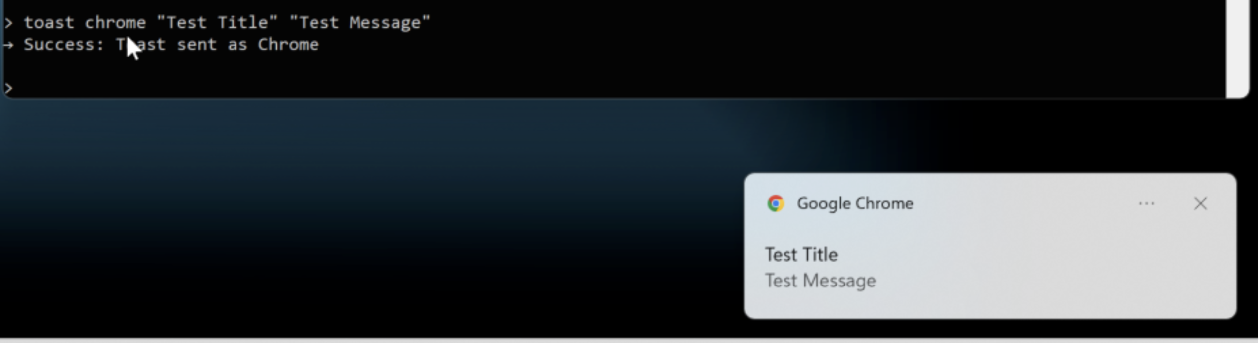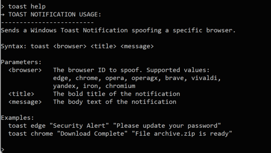 toasttoast <browser> <title> <msg>Spoofs a native Windows toast notification as a specific browser; resolves the browser’s AppID via Get-StartApps PowerShell lookup with fallback to hardcoded AppIDs; supports Edge (Stable/Beta/Dev/Canary), Chrome, Brave, Opera, Opera GX, Vivaldi, Yandex, Iron, and Chromium; uses ToastNotificationManager with the spoofed AppID